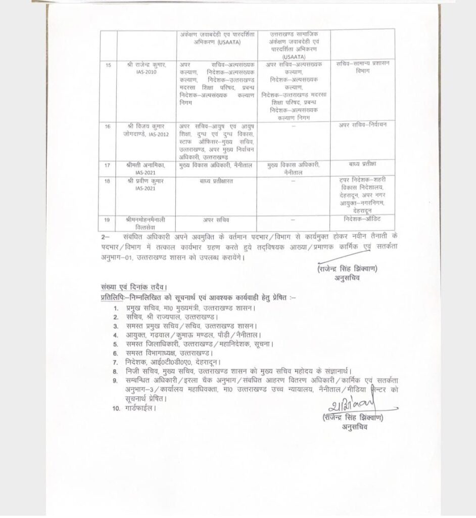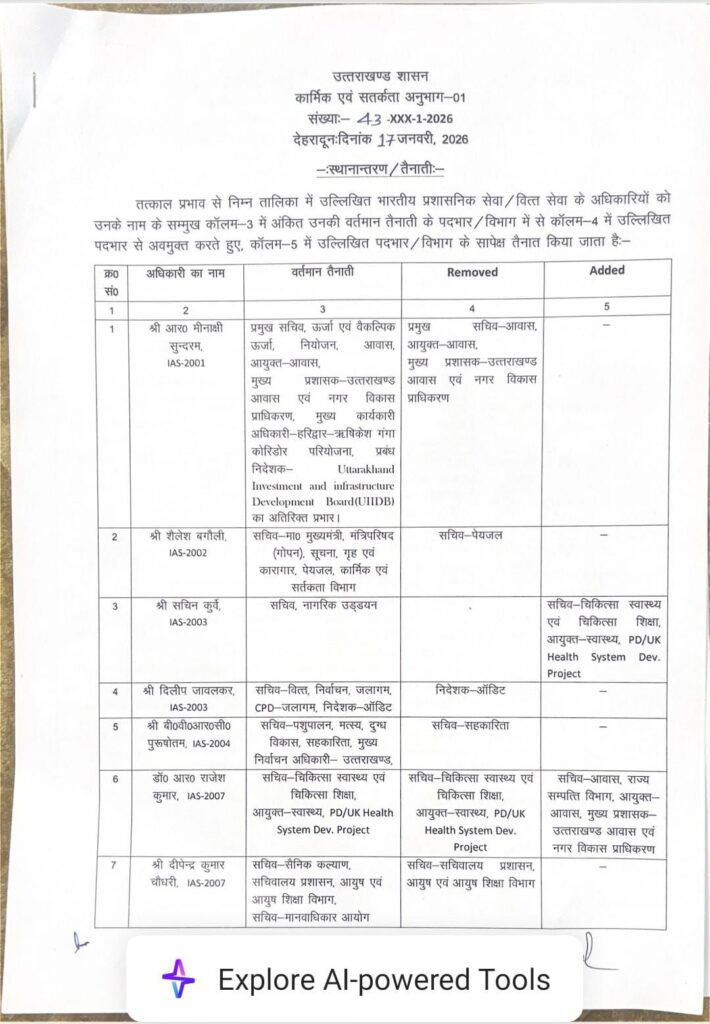 देहरादून। मुख्यमंत्री पुष्कर सिंह धामी के निर्देश पर उत्तराखंड शासन ने आईएएस एवं पीसीएस अधिकारियों के दायित्वों में फेरबदल किया है। शासन द्वारा 17 जनवरी 2026 को जारी आदेश के अनुसार 19 आईएएस और 11 पीसीएस अधिकारियों को नई जिम्मेदारियाँ सौंपी गई हैं।